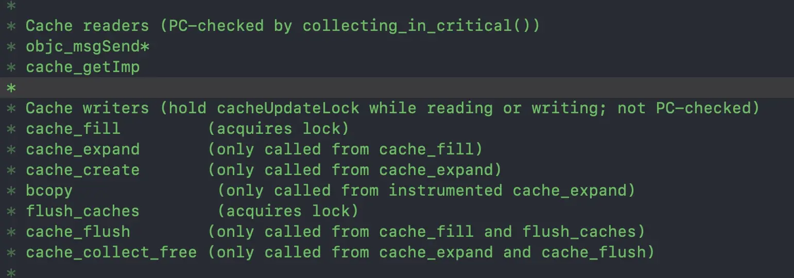 通过对objc_cache.mm源码的注释的阅读,我们可以得到一个缓存读写的大致过程。相关读取的过程,即在方法转发过程中,获取到已缓存的IMP函数指针,从而获得方法