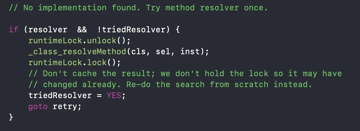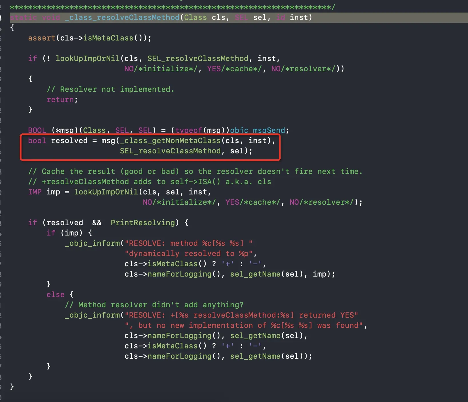 bool resolved = msg(cls, SEL_resolveInstanceMethod, sel);