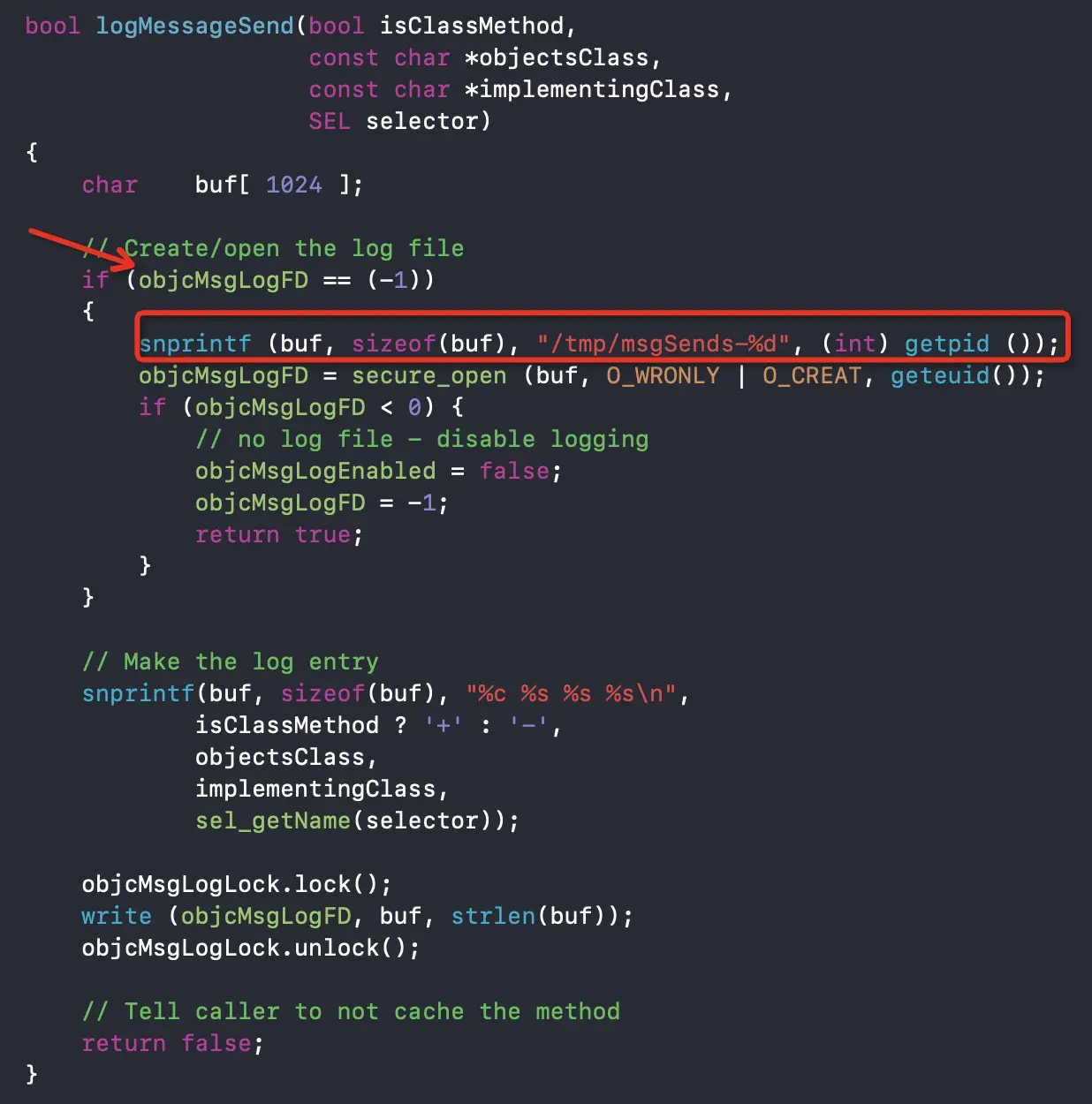 log_and_fill_cache,说明系统会对缓存的方法加日志,我们可以通过系统的日志在查看方法调用的情况。通过方法我们可以看到,日志会记录在/tmp/msgSends目录下,且通过objcMsgLogEnabled变量来控制是否存储日志