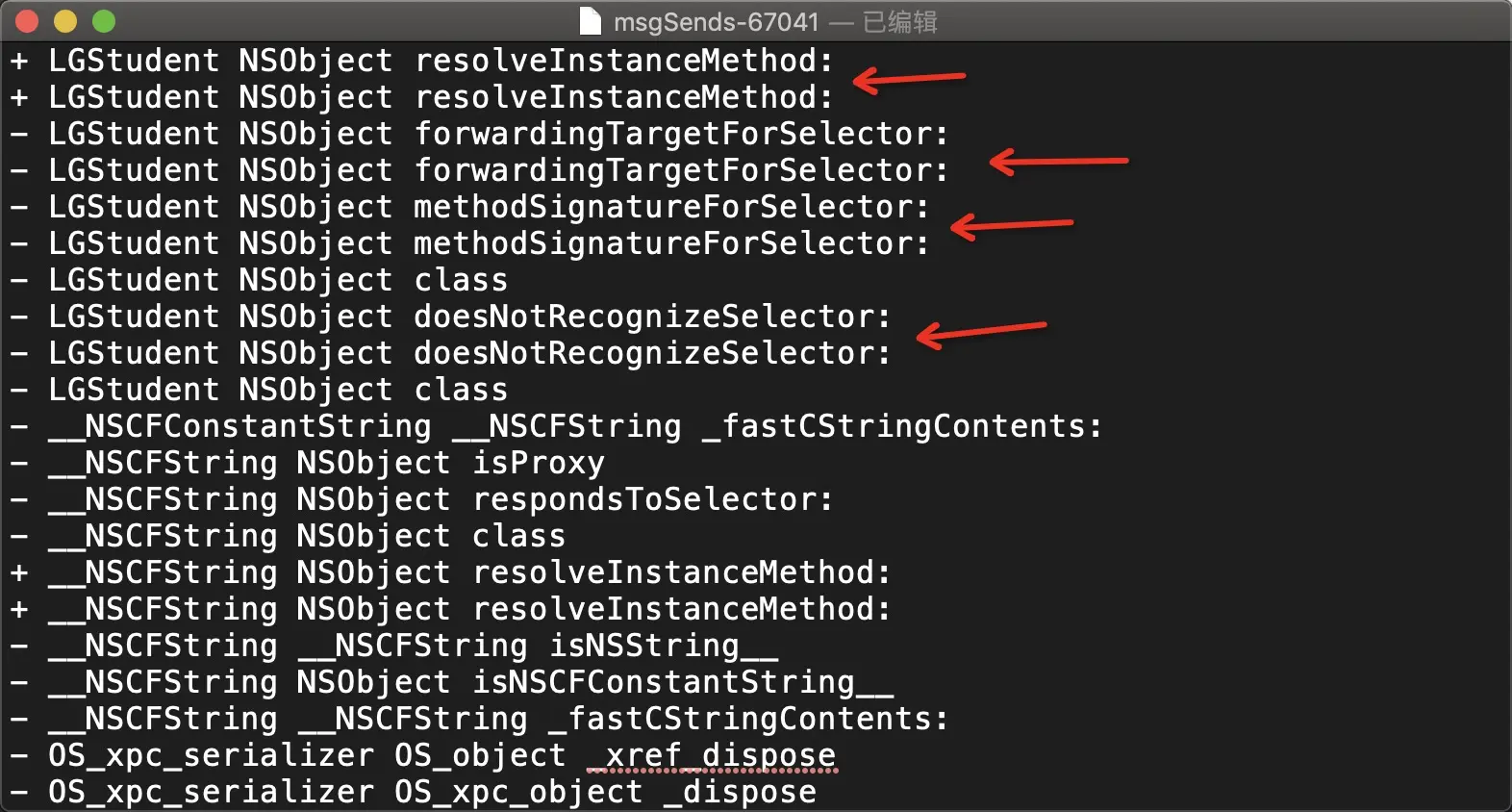 通过寻找/tmp/msgSends文件,如下图所示,我们发现经过了resolveInstanceMethod,forwardingTargetForSelector,methodSignatureForSelector,doesNotRecognizeSelector,这就是我们要寻找的处理方法。