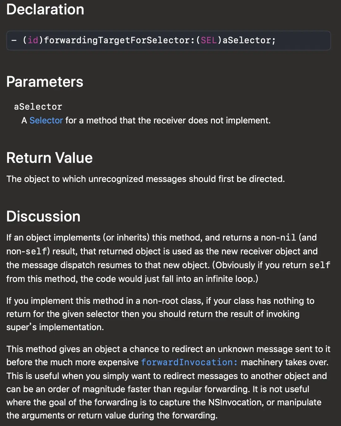 通过查看- (id)forwardingTargetForSelector:(SEL)aSelector方法的文档,我们可得