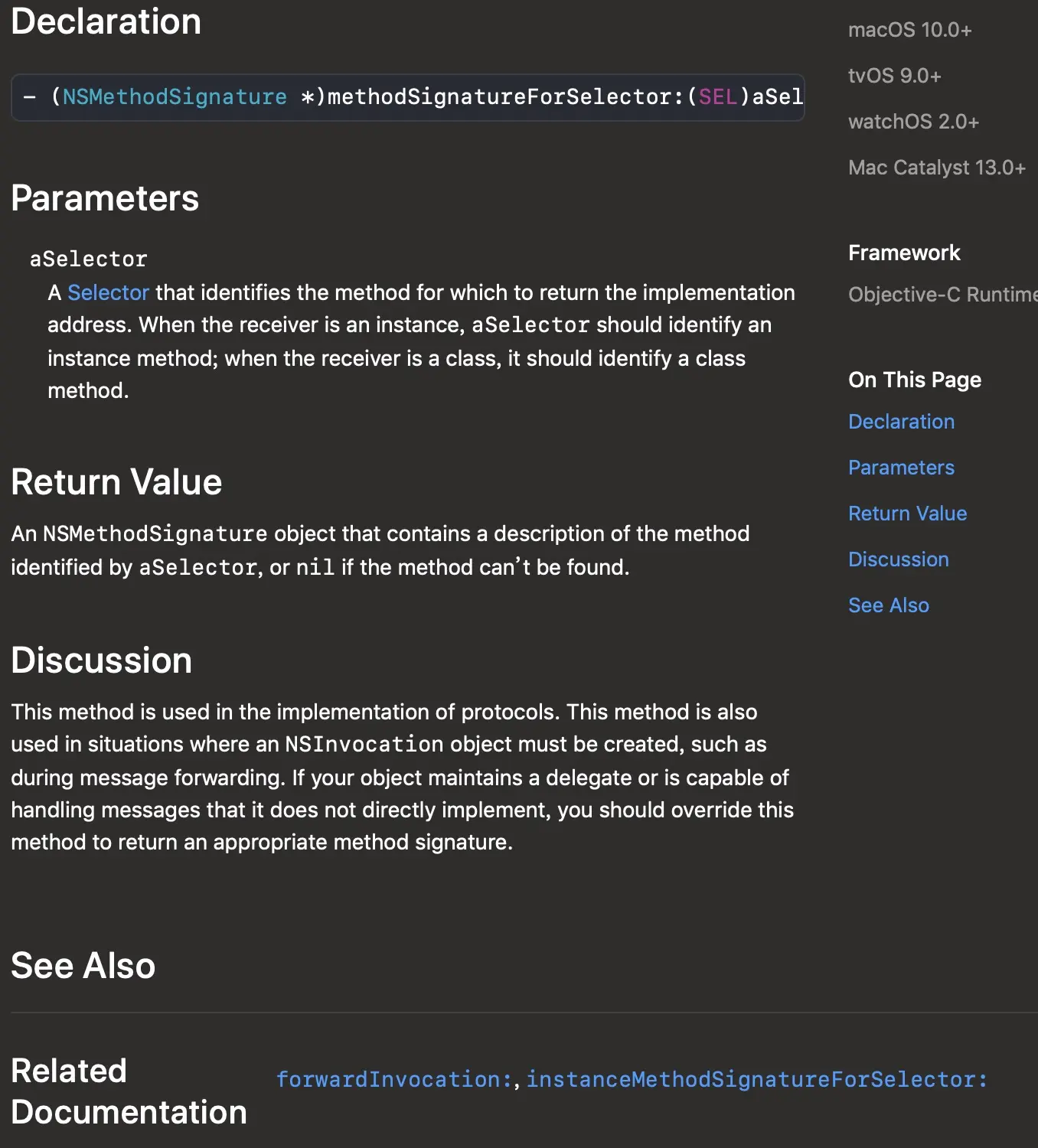 - 该方法是让我们根据方法选择器SEL生成一个NSMethodSignature方法签名并返回,这个方法签名里面其实就是封装了返回值类型,参数类型等信息。
