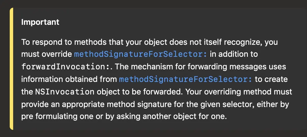 然后实现methodSignatureForSelector后,还必须实现- (void)forwardInvocation:(NSInvocation *)anInvocation;方法进行处理,通过文档,我们可得