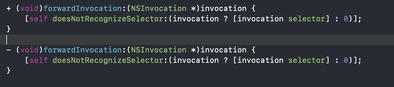 forwardInvocation和methodSignatureForSelector必须是同时存在的,底层会通过方法签名,生成一个NSInvocation,将其作为参数传递调用- 查找可以响应