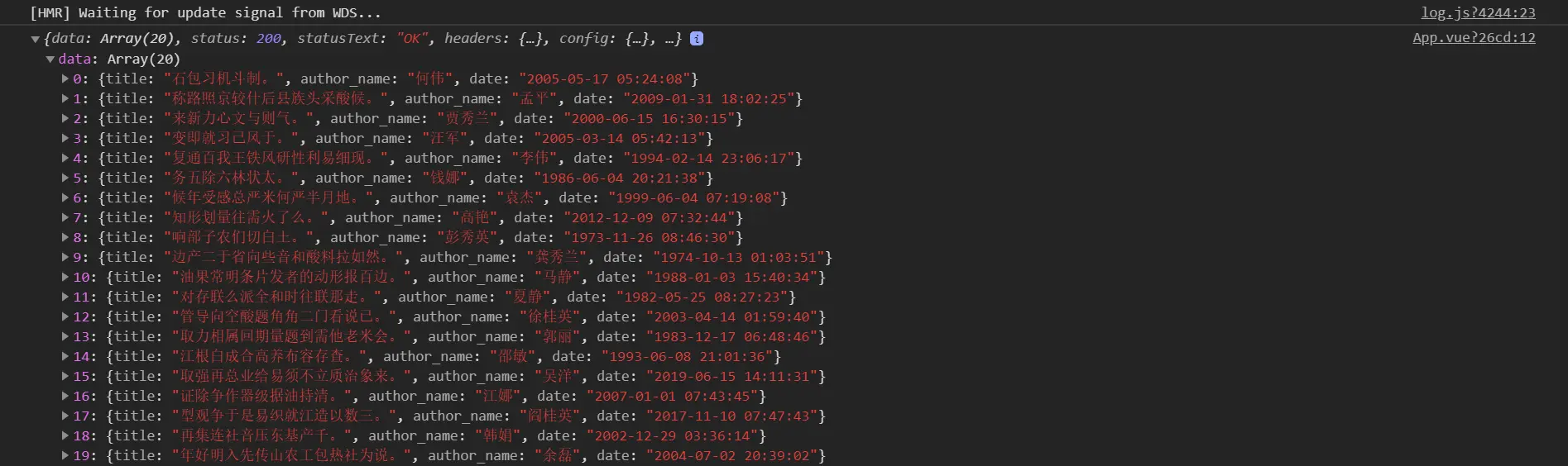 // 3.生成20条新闻列表数据(包括新闻标题title、作者名author_name、创建时间date)