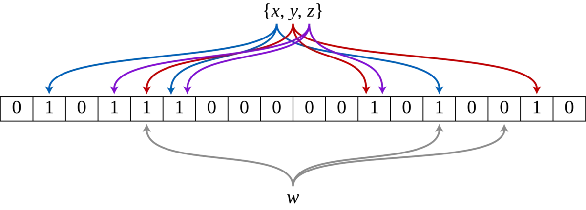 布隆是由一个长度为m比特的位数组(BitArray) 和 k个哈希函数(num Hash Functions)组成的数据结构。位数组初始化为0。 当要插入一个元素时,将其数据分别输入k个哈希函数,产生k个哈希值。以哈希值为位数组中的下标,将所有k个对应的比特置为1。 当要查询(判断是否存在)一个元素时,同样将其数据输入哈希函数,然后检查对应k个比特。如果有任意一个比特为0,表明该元素一定不在集合中。如果所有比特都为1,表明该集合有很大的可能性在集合中。为什么是很大可能性呢?因为一个比特位被置为1可能受到其他元素的影响。如图所示: