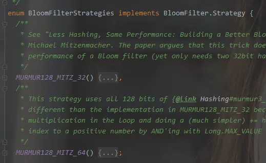BloomFilterStrategies.MURMUR128_MITZ_64是Strategy两个实现之一,Guava以枚举方式提供这两个实现。