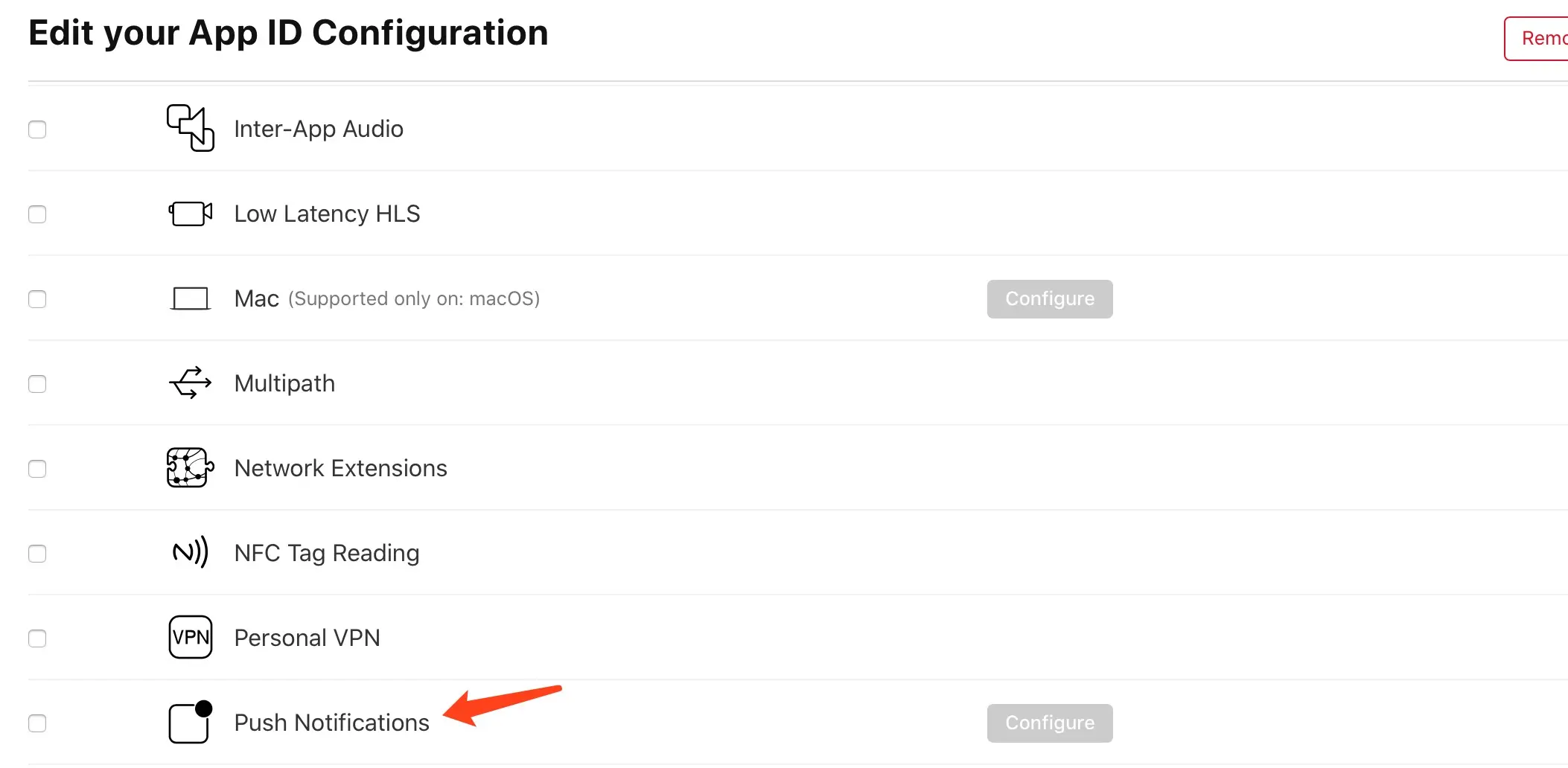 另外就是 Push Notification Entitlement 的警告,是说你的应用没有配置推送相关的证书和设置,如果你的应用没有用到对应的功能,比如在 Developer 后台看如下图所示的推送是否勾选了,如果勾选了就需要在应用内配置对应的推送服务,iOS 上 APNS 还需要设置对应的推送证书,一般推送证书还会分开发和生产两种,如果没有使用推送可以忽略警告。