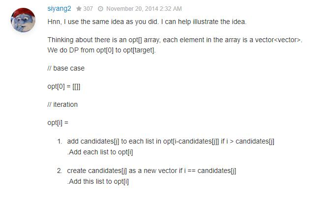 opt[target],表示和为 target 的所有情况的组合,也就是题目所要求的。