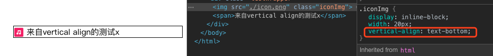 当我们为图片添加vertical-align:text-bottom的时候,可以发现效果好了许多,但是实际上我们还需要根据需求来进行调整。通过上面的图片我们也可以发现,vertical-align这个属性只对设置该属性的元素起到效果,它并不会影响一行中其它的内联元素。