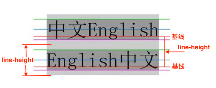 行高(line-height)也就是两条红线(baseline)之间的距离,对于一文本行来说font-size决定了顶线到底线之间的距离,而line-height和font-size的差值称为行间距。