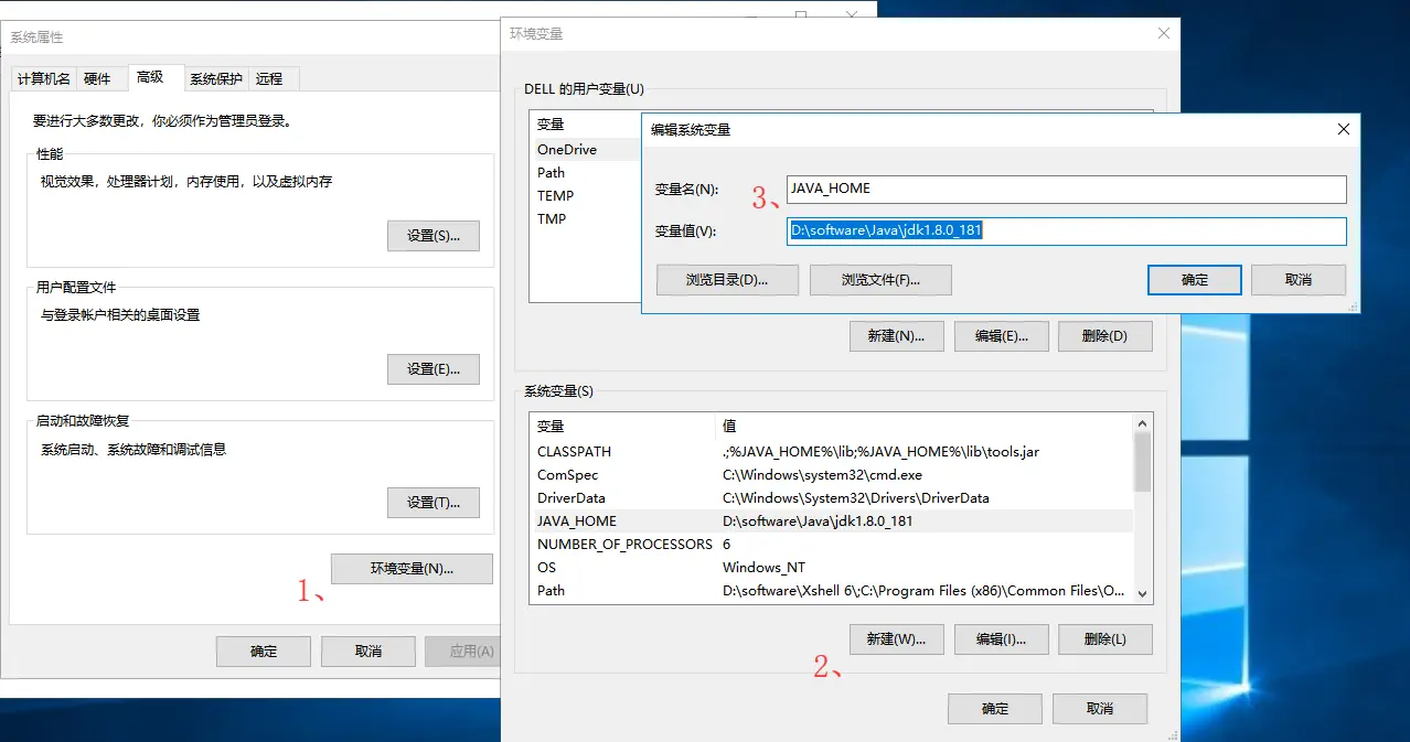 (1)JAVA_HOME----D:\software\Java\jdk1.8.0_181” (根据自己安装路径填写)