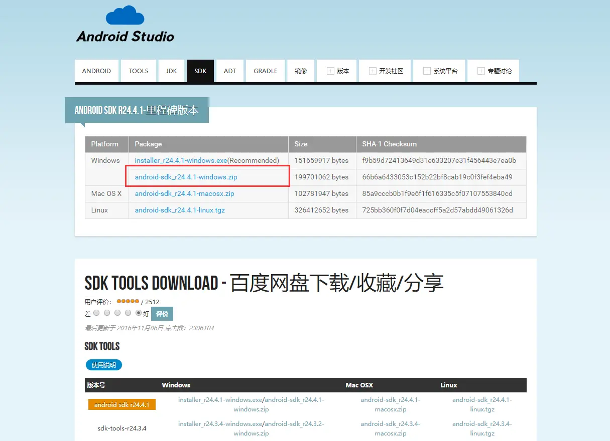 下载地址:http://tools.android-studio.org/index.php/sdk/(推荐使用)