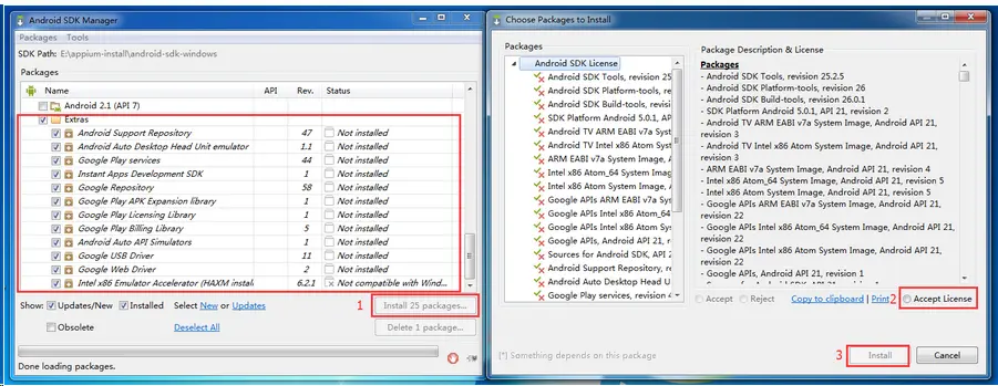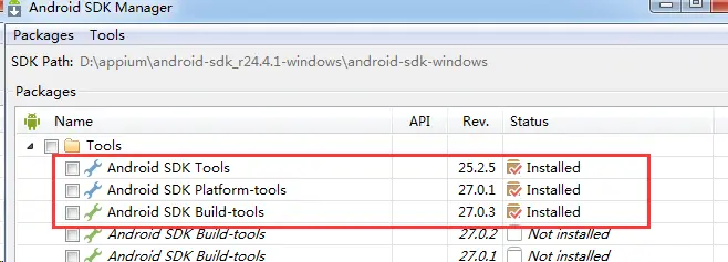 3、勾选你要下载的API版本和对应的android版本,后面模拟器会用到(不下载用其它模拟器也行,或者真机),然后坐等下载。安装Tools下的Android SDK Platform-tools和Android SDK Build-tools,Android SDK Tools可以选择是否更新,建议直接更新。镜像:随便选个版本也可以选择多个版本安装,我喜欢直接连接真机进行,由于镜像比较大,所以喜欢真机的朋友们可以不下载镜像,GoogleFQ安装:Extras文件夹下所有的全部安装。