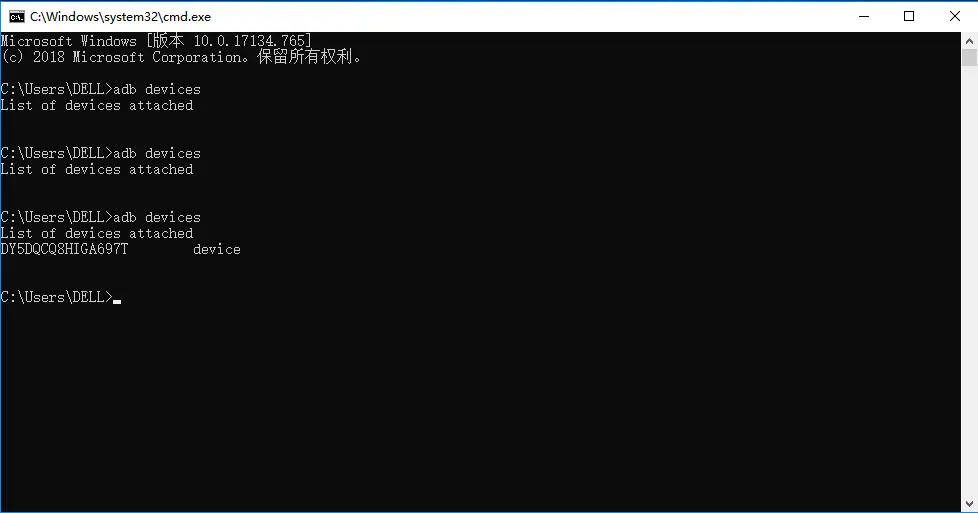 2.打开cmd输入:adb devices,当屏幕上出现一串字符,后面显示devices说明连接成功(出现其它的提示,得检查自己的环境了)