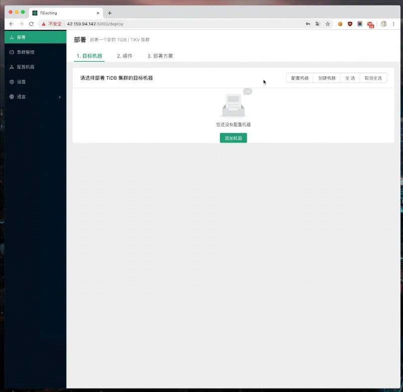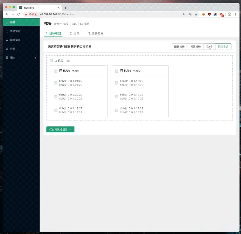 创建完目标机器(后文介绍机器添加方式)后,就可以自由选择其中的机器进行部署。界面上可以自行勾选想要的组件,或取消勾选不想要的组件。比如不想要监控大礼包,就可以直接取消勾选「监控」。另外 TiDB 也是可以取消勾选的,适用于只想使用 TiKV 的情况。