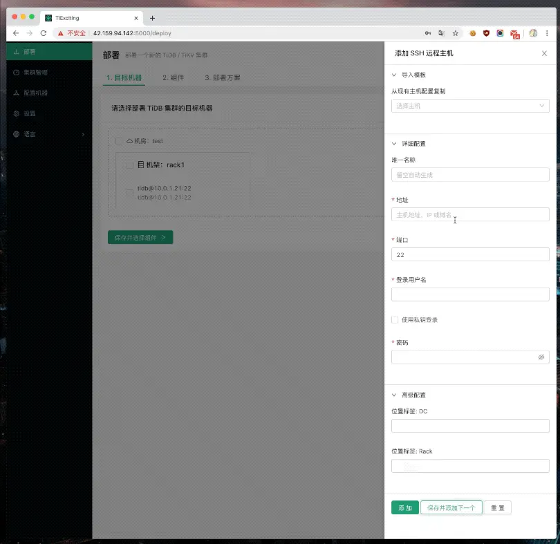 启动 TiExciting 后,界面会引导用户首先增加机器,包括填写连接方式等。这里可以指定密码或密钥登录,无需 root,也无需创建特别的用户,只需填写运维人员平时连接上去的方式即可。增加机器时候的设置也可以从现有机器设置复制。