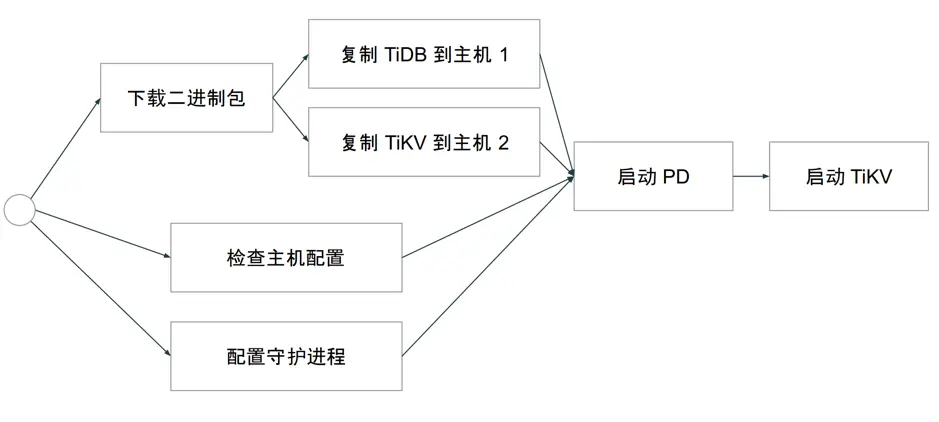 为了尽可能地快,TiExciting 会尽可能地基于文件哈希来复用文件,例如已下载且校验通过的 TiDB 二进制大礼包就不需要重复下载,已经成功部署的同理。TiExciting 还实现了异步有向无环图的任务调度机制,当所有先决任务完成后,后续任务就可以得到执行,且之间没有依赖关系的任务可以并行执行,如下图所示: