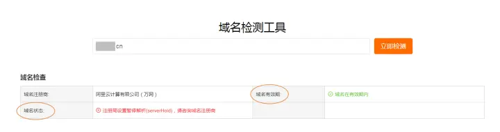 阿里云DNS为用户提供了 域名检测工具,可一键查询出域名有效期和域名状态是否存在异常。