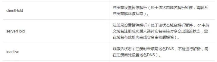 - 域名状态:如果域名处于clienthold、serverhold、inactive三种状态,则代表是因为域名状态异常导致解析异常。