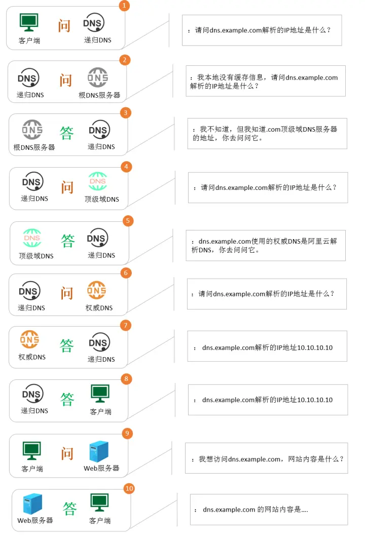 在进入进阶版前,要深入了解域名解析异常情况,绕不开的就得先了解域名解析递归流程,很多同学应该还不知道解析的110套路,简单来说就是在递归DNS未有缓存场景下,1次域名解析需要经历10次查询交互。