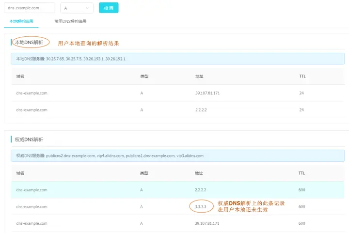 ② 如果本地DNS解析TTL过期后测试,仍然和权威DNS解析结果不一致,尝试检查公共DNS解析结果是否一致。