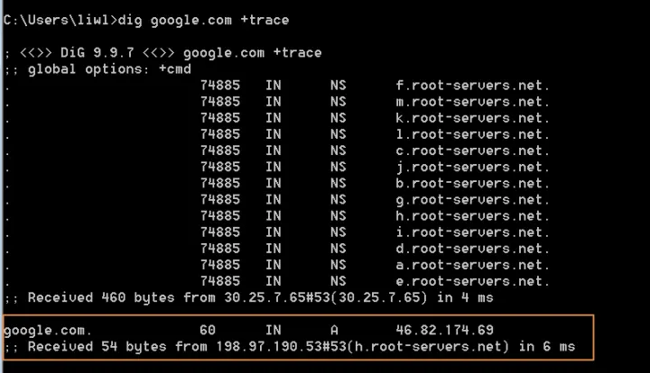 您也可以通过命令dig+trace测试,本地DNS向根DNS服务器查询时,直接返回了IP地址,则一般可判断为在DNS查询在根DNS服务器处就被阻断。
