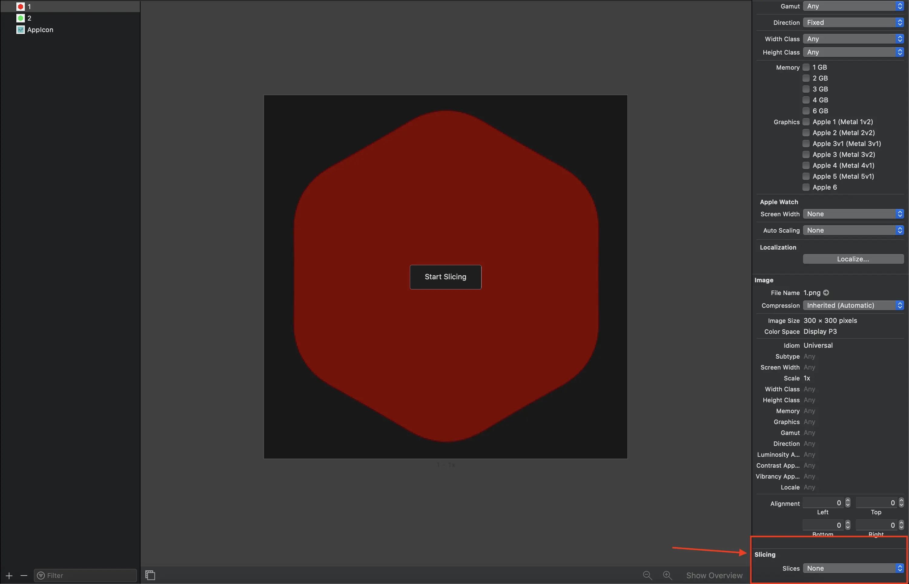第二种,本地图片我们都放在项目中的Assets.xcassets中,我们点击想要拉伸的图片,然后点击右下角的Show Slicing按钮