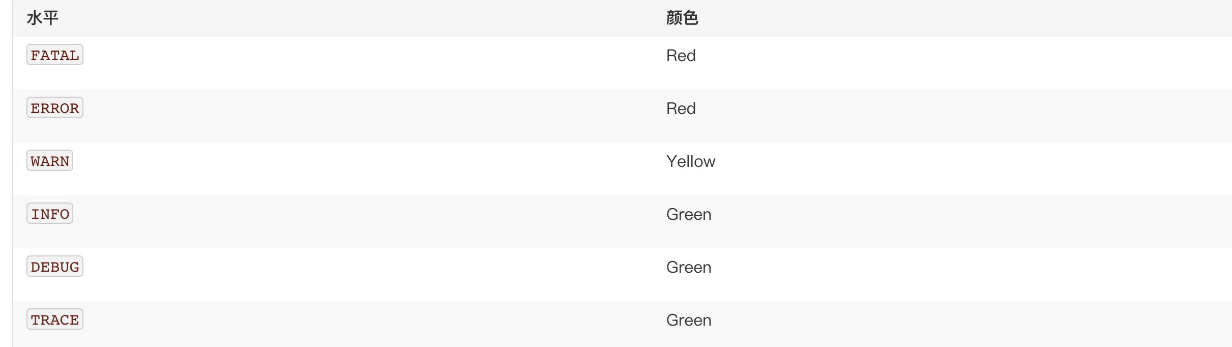 下表描述了日志级别默认到颜色的映射: