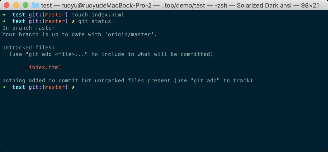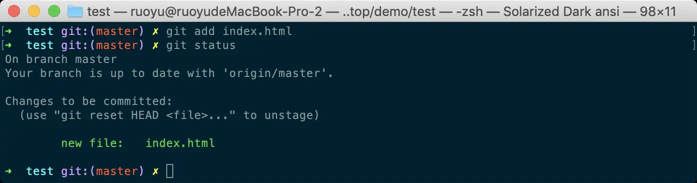 - 图片注释:我们把刚创建的index.html文件暂存起来了,可以看到他的状态变为《Changes to be committed》,变动《new file: index.html》将要被提交,也就是已追踪放入暂存区未提交状态。
