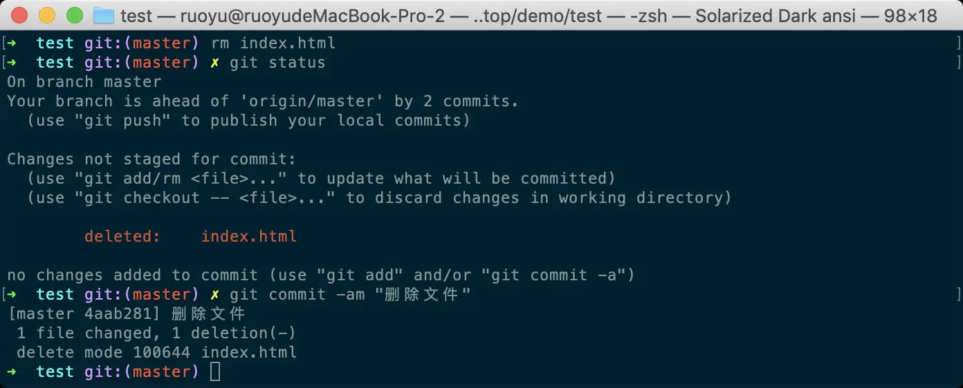 - 把已经追踪的文件index.html删除,那么该文件已被修改,此时状态为《Changes not staged for commit》,也就是变动《deleted:index.html》还未暂存。