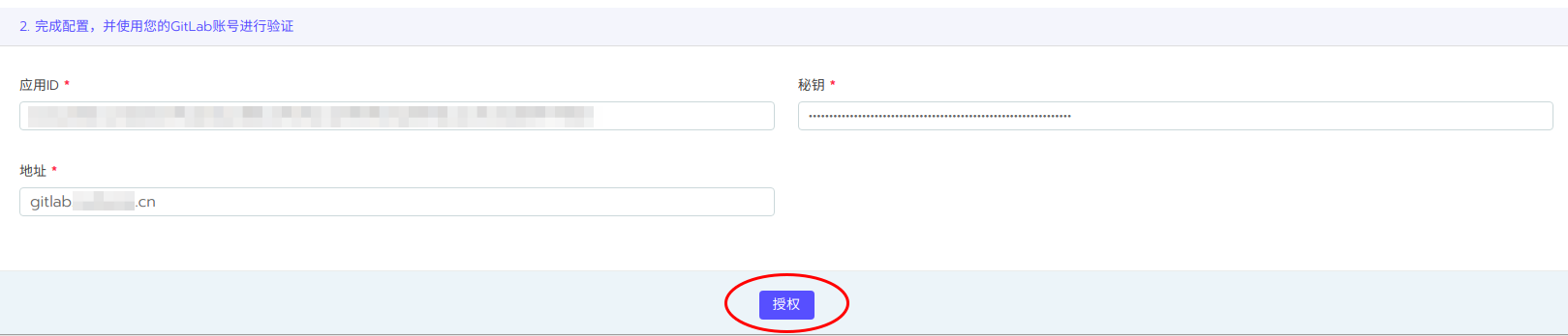 通常,流水线第一步是从代码仓库克隆代码,然后才是编译、测试和部署等一系列功能的设置,因此我们首先需要授权平台能够访问代码仓库。我们以gitlab仓库为例,将配置好的Application Id、secret和仓库地址填入到对应的文本框中,点击授权,这样我们就完成了仓库的授权配置。如图所示: