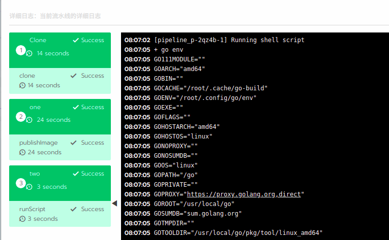 notification: {}如上,简单地配置了两个阶段,一个是构建发布镜像,一个是运行脚本,你可以按照自己项目的发布流程配置好pipeline,最后点击完成,我们就可以看到该pipeline自动运行了。pipeline的配置文件会推送到代码仓库中,这样就可以实现pipeline历史版本的回溯,支持从代码库直接读取pipeline配置文件,从而实现了Pipeline as Code的理念。点击查看日志,你可以看到pipeline各个阶段运行的详细日志信息。如图所示。