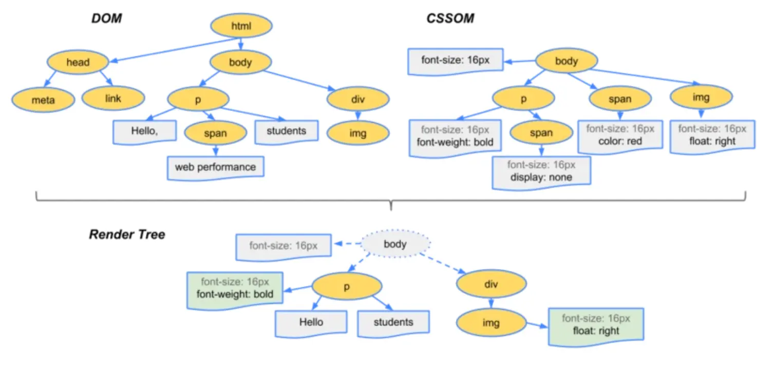 前面介绍了我们根据输入的HTML及CSS构建了DOM树和CSSOM树,但二者是独立的对象:DOM描述的是文档内容,CSSOM描述的是应用于文档的样式规则。浏览器会把DOM和CSSOM组合起来构建一个渲染树(Render-tree),渲染树会捕获页面上所有可见的DOM内容以及应用在每个节点上的CSSOM样式。 过程如下: