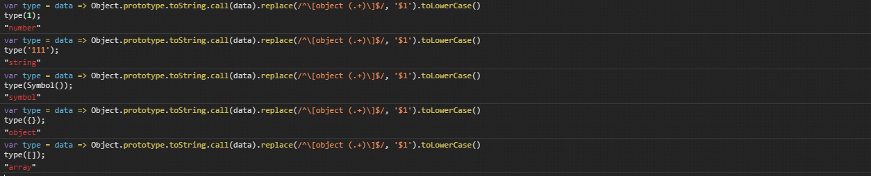const type = data => Object.prototype.toString.call(data).replace(/^\[object (.+)\]$/, '$1').toLowerCase();