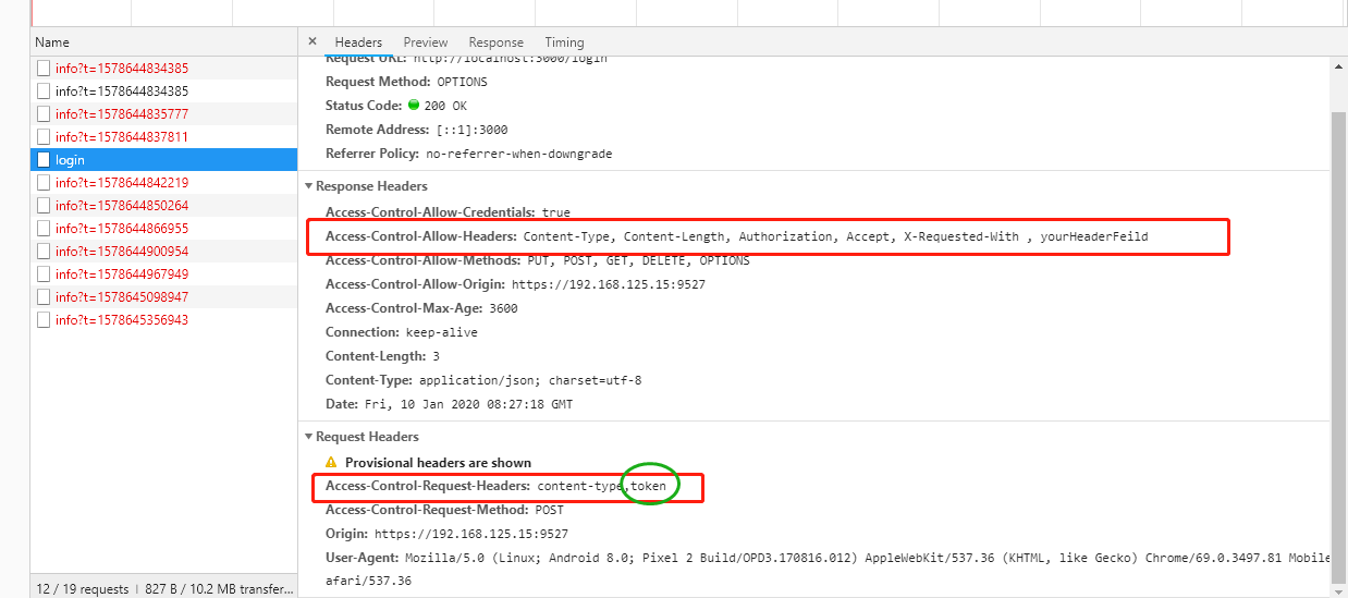 - 添加自定义头部变量token,Access-Control-Allow-Headers中并没有添加允许的token将会报错