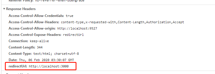 Access-Control-Expose-Headers:redirecturl redirectUrl:'http://localhost:3000'