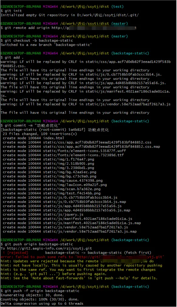 - git push -f origin 分支名 强制提交(除了这种只提交dist文件夹的情况外尽量不使用)