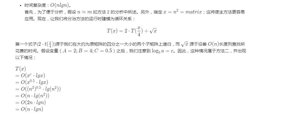 这道题相比之前的二维矩阵,可能有序性没有之前那么强,所以没法直接拉成一个一维数组利用二分法查找,需要结合其特性,进行查找。
