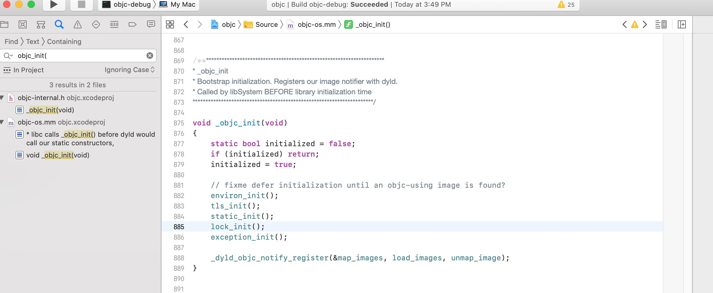 程序在刚运行时会把mach-o里的内容映射到相应的表里去,在此之前肯定有相应的准备条件或者配置,我们在git上下一份objc的源码,在源码中你会发现程序在运行是必然的来到 _objc_init:
