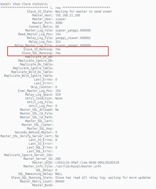 mysql> change master to master_host='192.168.21.200', master_user='xiaoer', master_password='xiaoer', master_log_file='xiaoer_yangqi.000006', master_log_pos=154;