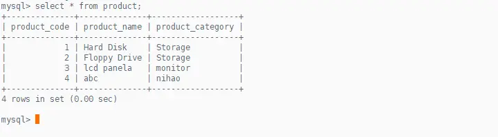 mysql> insert into product values(4,"abc","nihao");