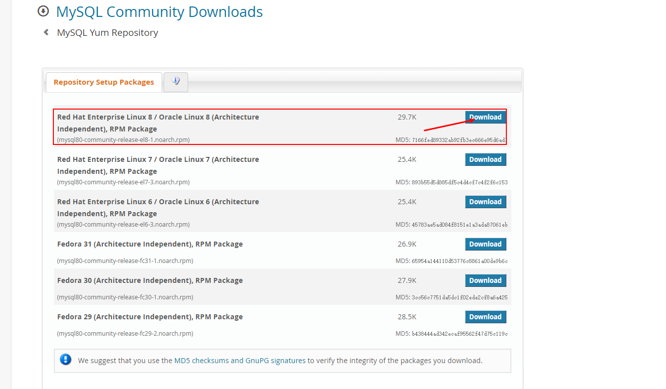 在 dev.mysql.com/downloads/r… 找到yum源的安装包
