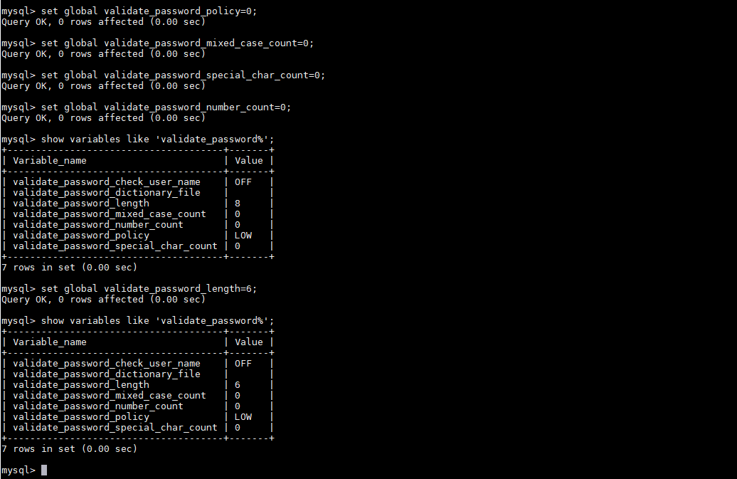 # 密码最小长度,参数默认为8,它有最小值的限制,最小值为:validate_password_number_count + validate_password_special_char_count + (2 * validate_password_mixed_case_count)