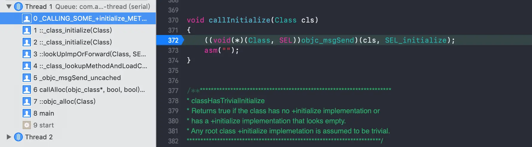 可以发现,在_class_initialize函数中初始化对象的过程中会调用callInitialize函数,