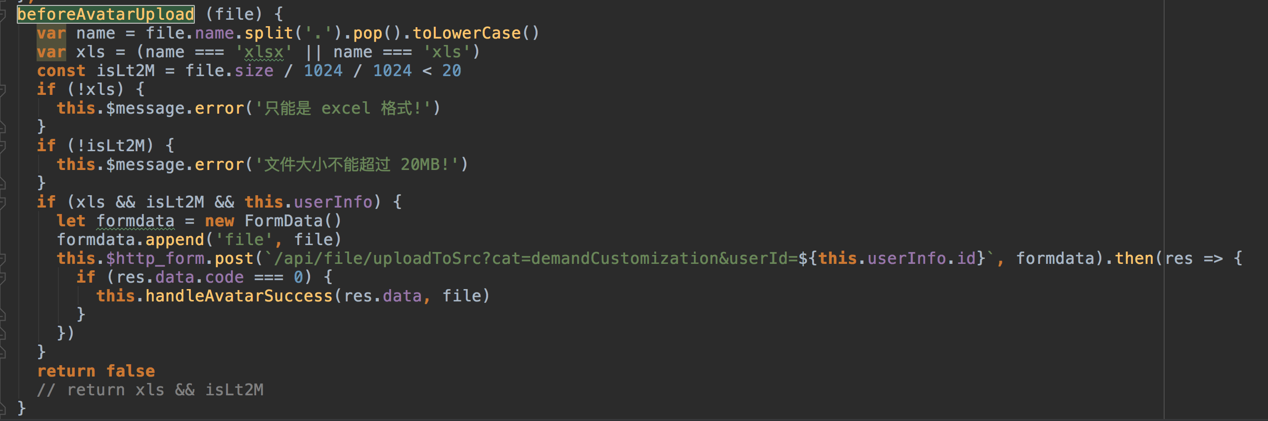 这个是写在upload组件brfore-upload上的,最后return false 是为了阻止下边流程的进行,把upload组件下边要做的文件上传和文件上传成功之后的操作接过来。