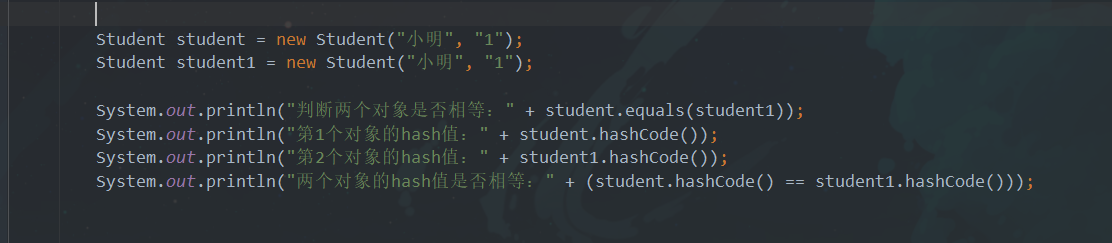 按照我们的常规理解,只要两个学生对象的id和name是一样的,我们就可以认为这两个学生对象指的是同一个人,因此重写了equals方法,让Student对象只要name和id相同就返回true,而且并没有重写hashCode方法。 在测试中,新建了两个Student对象,并且让他们的id和name完全一样,在调用equals方法时,返回为true,说明这两个对象时相等的。但是由于没有重写hashCode方法,所以这两个对象调用的hashCode还是Object类那里的hashCode方法,并且他们的值并不相等。