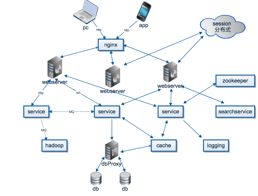 回到顶部 假设这是一个对外提供服务的大型分布式系统,用户连接到系统,做一些操作,产生一些需要存储的数据,那么在这个过程中,会遇到哪些组件、理论与协议呢