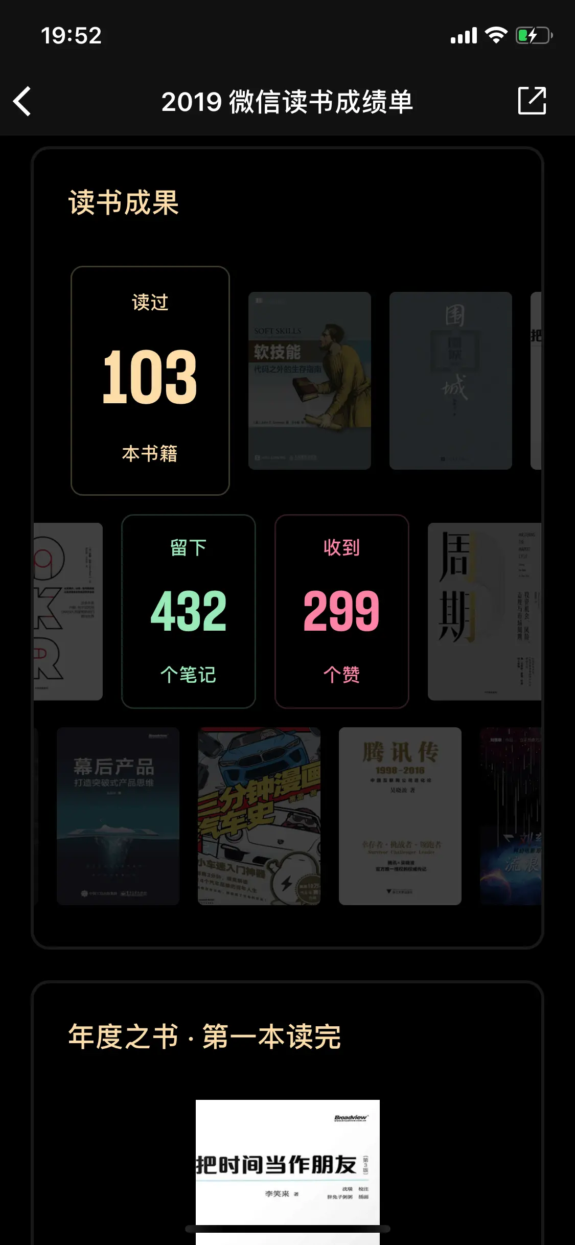 其它的一些书这里没有提到的,阅读过程也收获很多,例如《围城》(很经典,忘了是第几遍看了)、《刷新:重新发现商业与未来》、《穷查理宝典》、《终身成长》、《从一到无穷大》,《半小时漫画经济学》、《三分钟漫画汽车史》等,今年也尝试开始看一些快速阅读、快速消化的内容,如漫画、FM电台节目等,这里就不再详细介绍,安利一波微信读书,整体来讲电子书数量、排版、阅读体验都还不错,唯一让人摸不着头脑的是他们搞的铺天盖地的各种朋友圈分享、组队、答题等活动,就不能单纯地好好做一款读书软件吗?把书籍数量、阅读体验再提升一个档次。回头看了 18 年立的 flag 要阅读更多的书,但其实 19 年的读书时长并没有增长,阅读情况反而有所下降,而且内容还是比较单一,涉及的领域也大多围绕我自身的互联网行业,希望 2020 年能有所改变吧。在写完这篇读书总结后我突然意识到我在读的过程或者在写的过程也好,差不多快对书的一些内容没有多少记忆了,包括对书中的一些问题、现象的思考还是太少,例如我花了很多时间再去总结整本书的内容,却花了较少的时间来思考这本书给我带来的影响,这一点在之后的阅读和总结中会加以调整。当然我还是一直相信多读书是有意义的,可能短期内无法看见它带来的收益,我很享受发现一本好书,并一页一页地翻完的过程,能有收获那更好了,并且会持续把这些收获、影响分享扩散出去。之前在知乎看到一个很棒的回答:“读很多书的意义并不在对内容的记忆,而在于对一个独立人格和思想的培养,这些独立思想总结起来就是你的生存、处事的哲学”。这部分哲学有助于我们树立正确的三观,世界观说白了就是你对这个世界的态度,你是激进的还是保守的,你是左派还是右派;人生观是你选择如何过这一生,积极还是悲观;价值观也很重要,那些事是对的,哪些是错的,影响我日常对一些事物的判断和决策。积极的心态和坚定的信念将会带来正面的影响,而日常的一些困难或打击会给人挫败感,导致一些负面情绪,我们能做的是尽可能地让正面的影响盖过负面的情绪。2020年 继续加油,对这个世界保持好奇心,永远相信自己,相信美好的事情一定会发生。