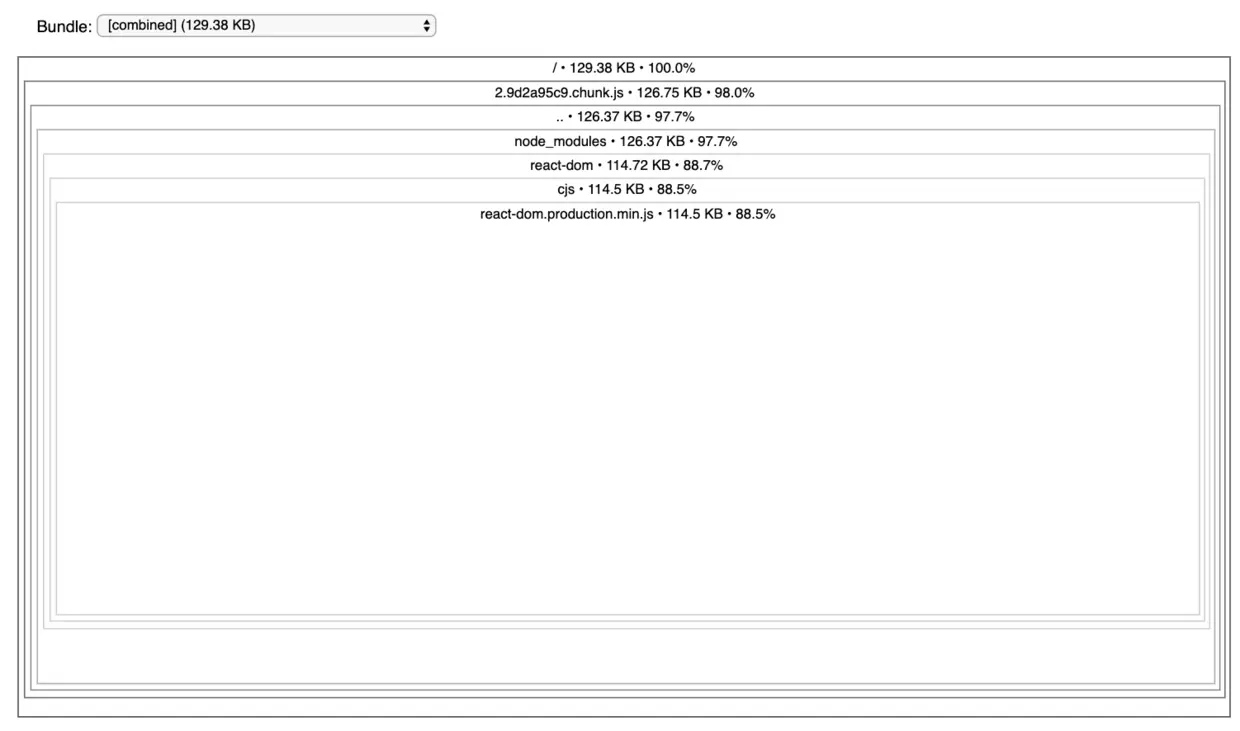 对于一个刚被 CRA 生成的 React App 来说,分析的结果如下,包大总计 129.38k。